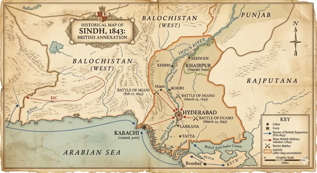 अठारहवीं और उन्नीसवीं शताब्दी के दौरान सिन्ध प्रदेश भारतीय उपमहाद्वीप का एक अत्यंत महत्वपूर्ण क्षेत्र था। इस प्रदेश की भौगोलिक स्थिति अत्यंत सामरिक थी, क्योंकि यह पश्चिम से भारत में प्रवेश करने का मुख्य द्वार था। सिन्धु नदी के किनारे बसा यह प्रदेश व्यापारिक दृष्टि से भी अत्यंत महत्वपूर्ण था। ब्रिटिश ईस्ट इंडिया कंपनी ने धीरे-धीरे सिन्ध में अपनी पैठ बनाई और अंततः 1843 में इसे पूरी तरह से अपने साम्राज्य में मिला लिया। यह विलय कूटनीति, छल-कपट और सैन्य शक्ति के प्रयोग का एक उत्कृष्ट उदाहरण है। इस लेख में हम सिन्ध के तालपुरा शासकों से लेकर ब्रिटिश साम्राज्य के विस्तार तक की पूरी कहानी को विस्तार से समझेंगे।